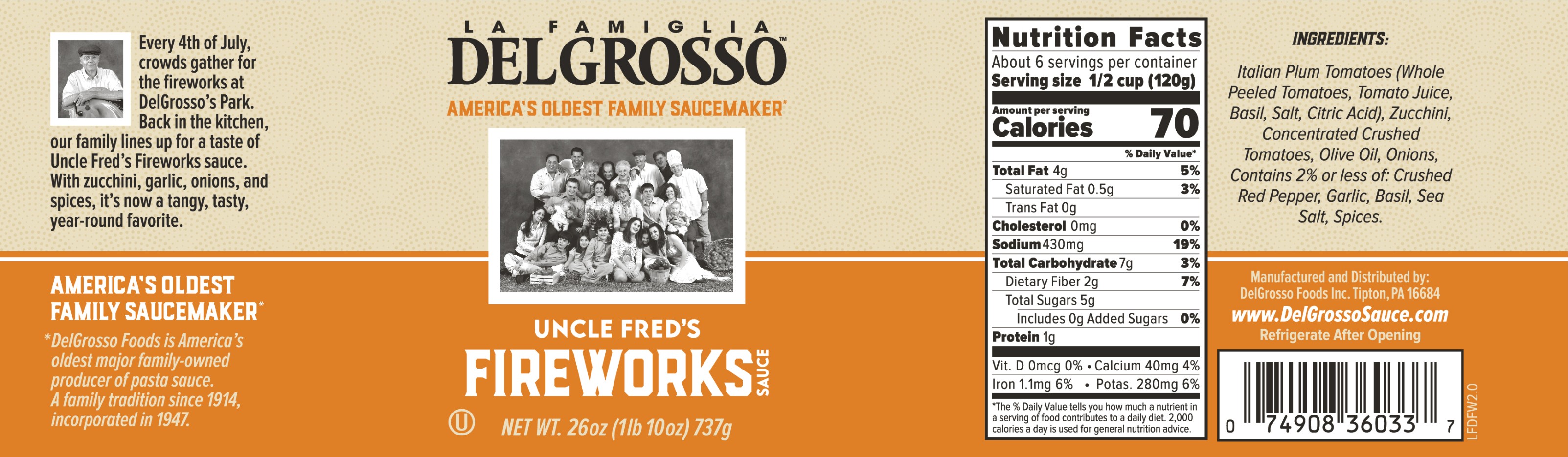 Every 4th of July, crowds gather for the fireworks at DelGrosso’s Park. Back in the kitchen, our family lines up for a taste of Uncle Fred’s Fireworks sauce. With zucchini, garlic, onions, and spices, it’s now a tangy, tasty, year-round favorite.